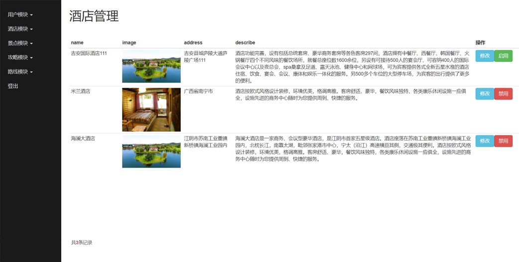 旅游網(wǎng)站畢業(yè)設(shè)計(jì)使用了spring mvc,spring,hibernate的框架組合,前端使用thymleaf模板展示。分為前端和后端兩部分,主要功能包括:游玩路線,游玩攻略,酒店預(yù)訂,景點(diǎn)預(yù)定,用戶管理,酒店管理,景點(diǎn)管理,路線管理等內(nèi)容。業(yè)務(wù)需求和代碼數(shù)量相對(duì)較多,適合基礎(chǔ)比較好的同學(xué)參考學(xué)習(xí)。