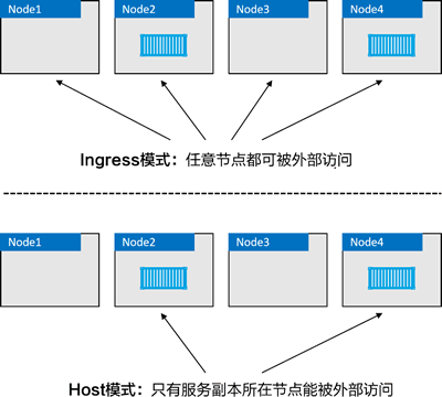 通過 Ingress 模式發(fā)布的服務(wù),可以保證從 Swarm 集群內(nèi)任一節(jié)點(diǎn)(即使沒有運(yùn)行服務(wù)的副本)都能訪問該服務(wù);以 Host 模式發(fā)布的服務(wù)只能通過運(yùn)行服務(wù)副本的節(jié)點(diǎn)來訪問。下圖展示了兩種模式的區(qū)別。