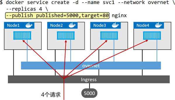 ? target=80 表示發(fā)送到 published 端口 5000 的請(qǐng)求,會(huì)映射到服務(wù)副本的 80 端口之上。