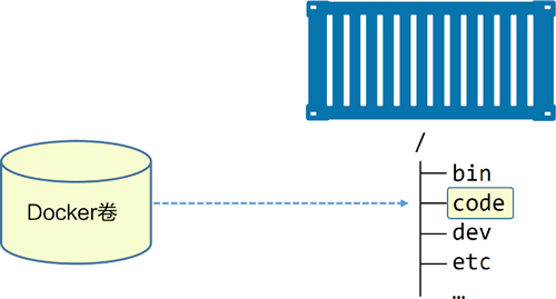 上圖中,/code 目錄是一個(gè) Docker 卷。容器其他目錄均使用臨時(shí)的本地存儲(chǔ)。卷與目錄 /code 之間采用帶箭頭的虛線連接,這是為了表明卷與容器是非耦合的關(guān)系。
