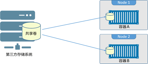 Docker 能夠集成外部存儲(chǔ)系統(tǒng),使得集群間節(jié)點(diǎn)共享外部存儲(chǔ)數(shù)據(jù)變得簡(jiǎn)單。例如,獨(dú)立存儲(chǔ) LUN 或者 NFS 共享可以應(yīng)用到多個(gè) Docker 主機(jī),因此無(wú)論容器或者服務(wù)副本運(yùn)行在哪個(gè)節(jié)點(diǎn)上,都可以共享該存儲(chǔ)。下圖展示了位于共享存儲(chǔ)的卷被兩個(gè) Docker 節(jié)點(diǎn)共享的場(chǎng)景。接下來這些 Docker 節(jié)點(diǎn)可以將共享卷應(yīng)用到容器之上。