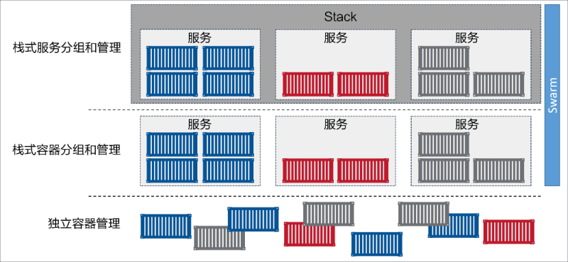 從體系結構上來講,Stack 位于 Docker 應用層級的最頂端。Stack 基于服務進行構建,而服務又基于容器,如下圖所示。