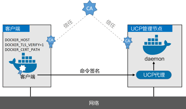 最終結(jié)果就是所有 Docker 命令都會(huì)在客戶端使用用戶證書簽名,然后經(jīng)由網(wǎng)絡(luò)發(fā)送到遠(yuǎn)端的 UCP 管理節(jié)點(diǎn),如下圖所示。