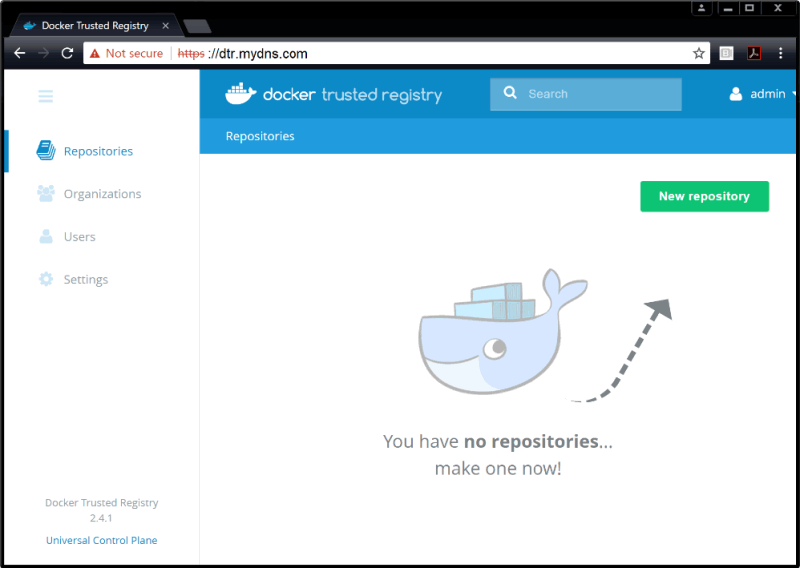 ⒈ 登錄 UCP Web 界面,單擊 Admin > Admin Settings > Docker Trusted Registry。