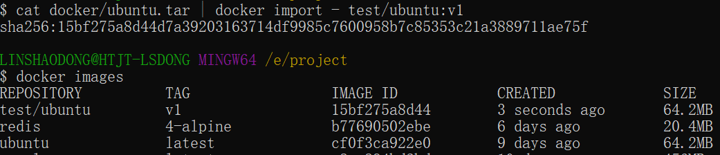 $ cat docker/ubuntu.tar | docker import - test/ubuntu:v1