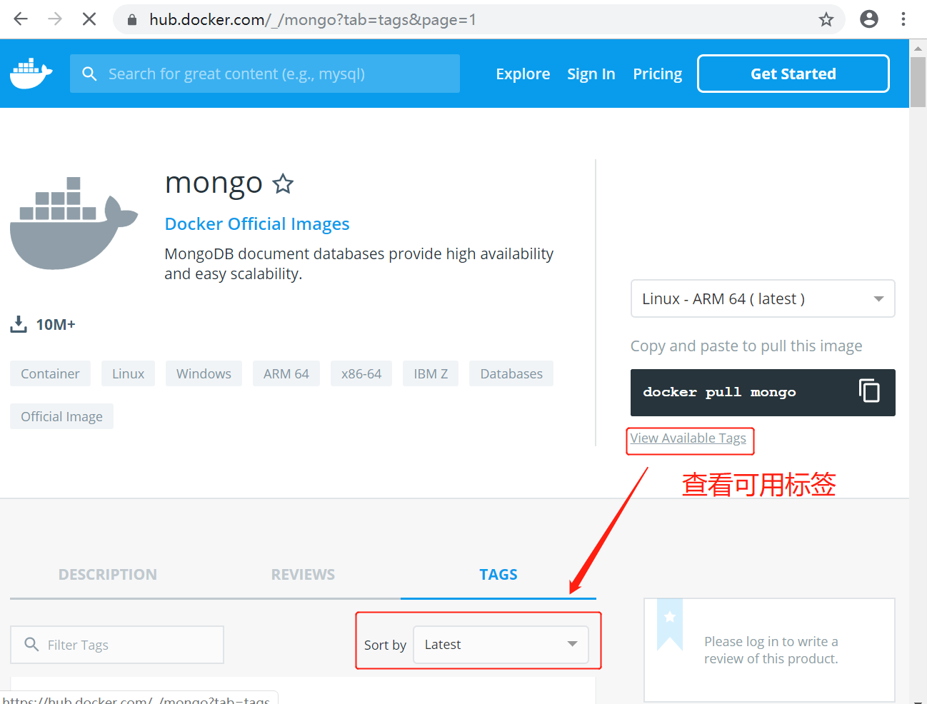 可以通過 Sort by 查看其他版本的 MongoDB,默認(rèn)是最新版本 mongo:latest。