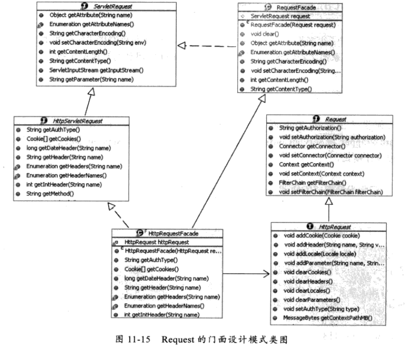 可以看到,HttpRequestFacade類封裝了HttpRequest接口,能夠提供數(shù)據(jù),通過HttpRequestFacade訪問到的數(shù)據(jù)被代理到HttpReauest中、通常被封裝的對象都被設(shè)為Private或者Protectd的,防止在Facade中直接訪問。