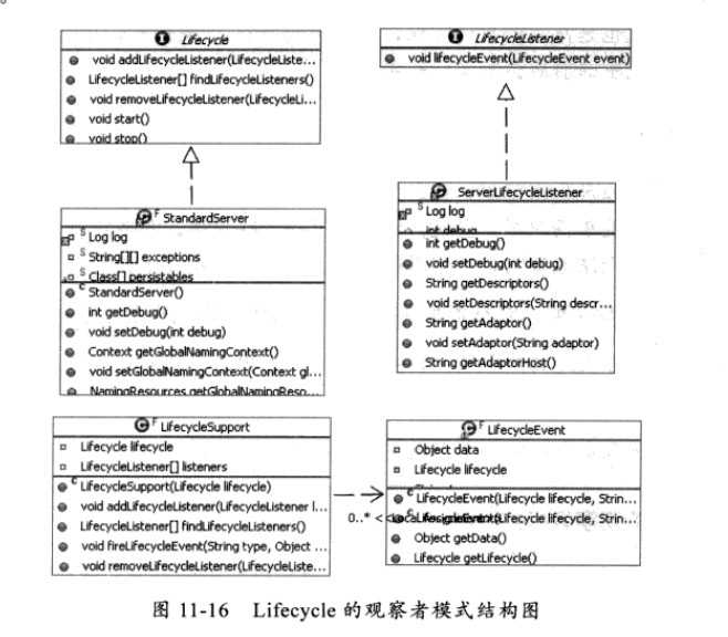 Tomcat中觀察者模式也有多處使用,前面講的控制組件生命周期的Lifecycle就是這 種模式的體現(xiàn),還有對Servlet實(shí)例的創(chuàng)建、Session的管理、Container等都是同樣的原理。 下面主要看一下Lifecycle的具體實(shí)現(xiàn)。