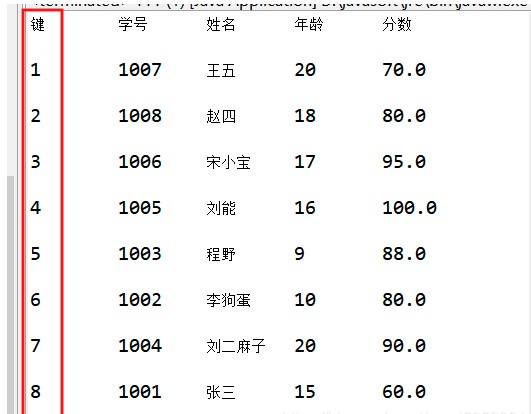 System.out.println("鍵"+"\t"+"學(xué)號"+"\t"+"姓名"+"\t"+"年齡"+"\t"+"分數(shù)");