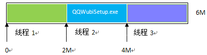 2.根據(jù)文件長度和線程數(shù)計算每條線程下載的數(shù)據(jù)長度和下載位置。如:文件的長度為6M,線程數(shù)為3,那么,每條線程下載的數(shù)據(jù)長度為2M,每條線程開始下載的位置如下圖所示。