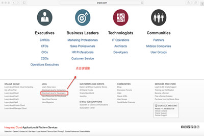 1.訪問Oracle官網(wǎng) ,瀏覽到首頁的底部菜單 ,然后按下圖提示操作。(如下圖所示:)