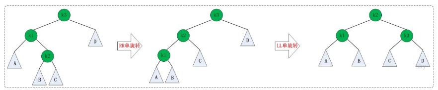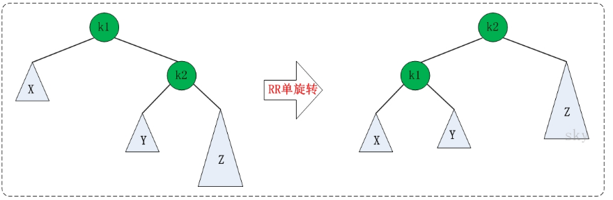 RR:RightRight,也稱(chēng)“右右”。插入或刪除一個(gè)節(jié)點(diǎn)后,根節(jié)點(diǎn)的右孩子(Right Child)的右孩子(Right Child)還有非空節(jié)點(diǎn),導(dǎo)致根節(jié)點(diǎn)的右子樹(shù)高度比左子樹(shù)高度高2,AVL樹(shù)失去平衡。