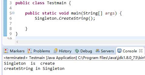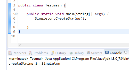 上面代碼的意思就是,假如單例類里面有g(shù)etInstance以外的其它靜態(tài)方法,跟單例沒啥關(guān)系的方法,如果使用了Singleton.CreateString()這種調(diào)用,就會自動創(chuàng)建Singleton這個類實(shí)例(雖然private構(gòu)造已經(jīng)防止了你人為去new這個單例),這是開發(fā)人員不愿看到的,我運(yùn)行下面代碼(此代碼調(diào)用了上面代碼的createString()方法)進(jìn)行展示: