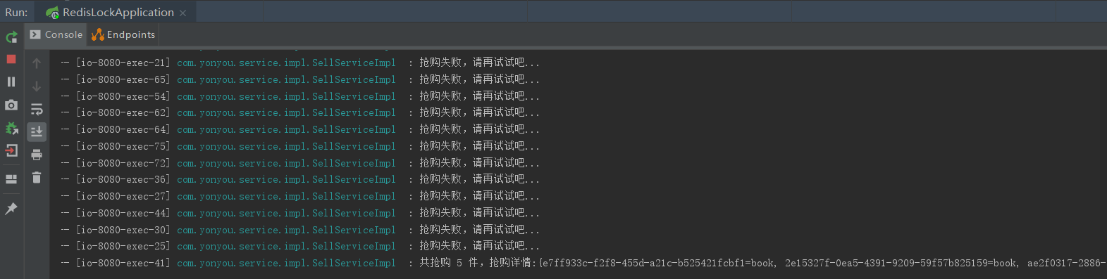return "國慶圖書大甩賣,庫存 " + products.get(productId) + " 件,現(xiàn)余 " + stock.get(productId) + " 件,已被搶購 " + orders.size() + " 件";