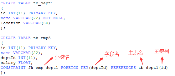 在表tb_emp5上添加了名稱為fk_emp_dept1的外鍵約束,外鍵名稱為deptId,其依賴于表tb_dept1的主鍵id