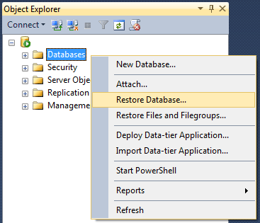 在左側(cè)導航欄中,右鍵單擊“數(shù)據(jù)庫”,然后單擊“還原數(shù)據(jù)庫”。