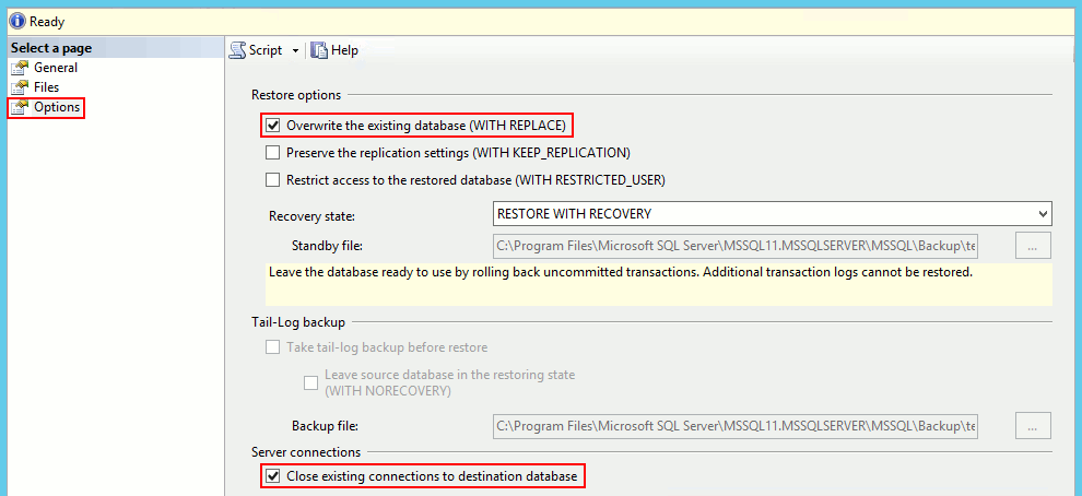 在右側(cè)窗格中,選擇Overwrite the existing database (WITH REPLACE)和Close existing connections to destination database。