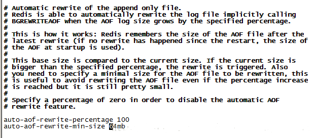 觸發(fā)條件:Redis會記錄上次重寫時AOF的大小,默認(rèn)配置是當(dāng)AOF文件大小是上次rewrite后大小的一倍,且文件大于64M時觸發(fā),可以在配置文件中修改。