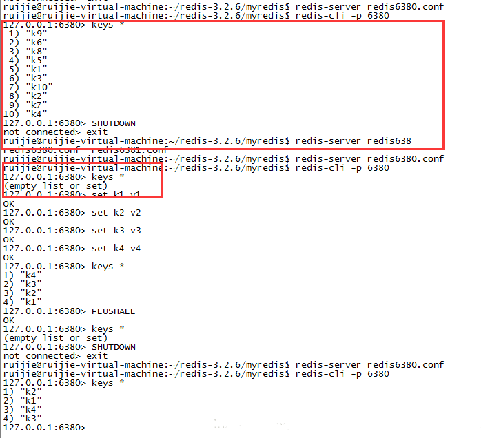 當(dāng)只開啟了RBD方式時數(shù)據(jù)庫中有10條數(shù)據(jù),當(dāng)開啟了AOF方式之后,由于appendonly.aof文件中沒有備份數(shù)據(jù),所以啟動后如第二個框中框出的所示沒有數(shù)據(jù)。從這里可以看出默認(rèn)首先使用AOF的存儲方式。