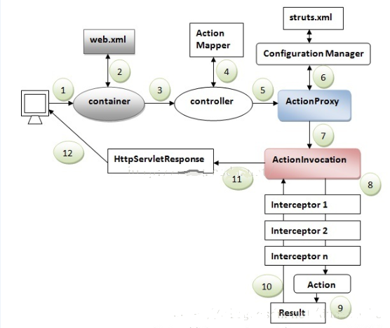 5.Action執(zhí)行完畢后,ActionInvocation負責(zé)根據(jù)struts.xml中的配置找到對應(yīng)的返回結(jié)果result。