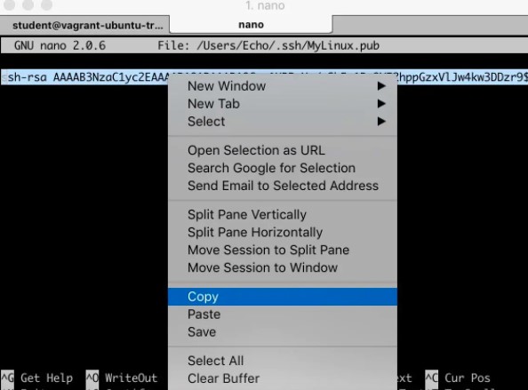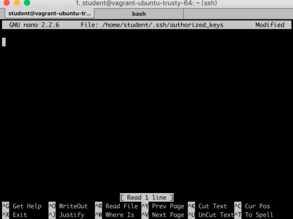 最后把實踐步驟1中生成的公鑰內(nèi)容復制粘貼到里面。可以采用文本打開復制,也可以用nano編輯器復制。這里演示方式為nano打開復制: