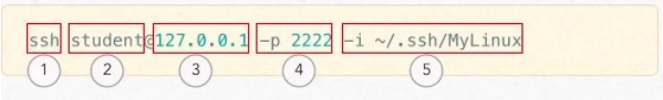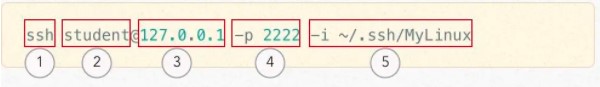 ssh student@127.0.0.1 -p 2222 -i ~/.ssh/MyLinux