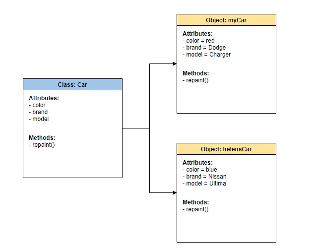 例如,假設(shè)我們創(chuàng)建一個(gè)類,Car以包含所有汽車必須具備的特性color,brand和model。然后我們創(chuàng)建一個(gè)Car類型對(duì)象的實(shí)例,myCar來代表我的特定汽車。
