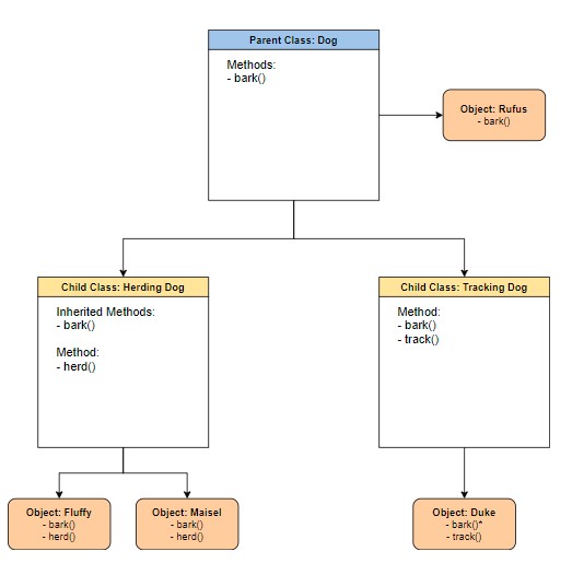 該herd()方法在子HerdingDog類中定義,因此從該類實(shí)例化的兩個(gè)對(duì)象Maisel和可以訪問該方法。FluffyHerdingDogherd()