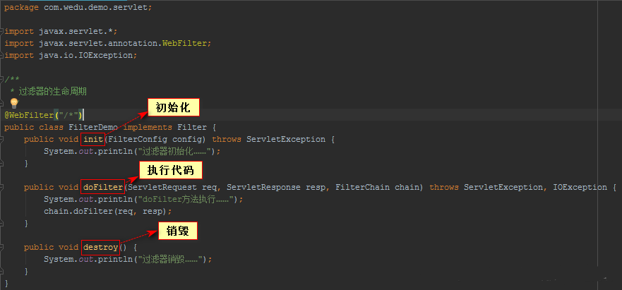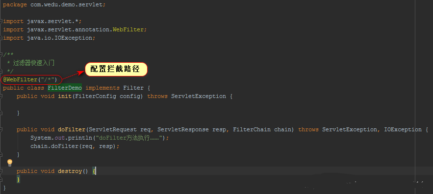 public class FilterDemo implements Filter { public void init(FilterConfig config) throws ServletException { } public void doFilter(ServletRequest req, ServletResponse resp, FilterChain chain) throws ServletException, IOException { System.out.println("FilterDemo……"); chain.doFilter(req, resp); } public void destroy() { }