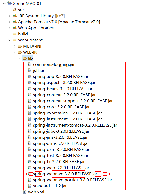這里我們加入了 Spring 3.2 的所有 jar 包,正好也佐證了上面所說的 SpringMVC 是 Spring 架構(gòu)的一部分,注意:一定要包括紅色橢圓圈起來的 spring-webmvc-3.2.0.RELEASE.jar