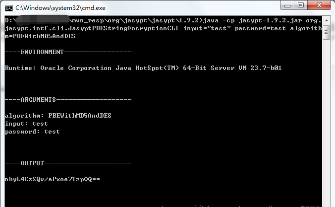 java -cp jasypt-1.9.2.jar org.jasypt.intf.cli.JasyptPBEStringEncryptionCLI input="test" password=test algorithm=PBEWithMD5AndDES