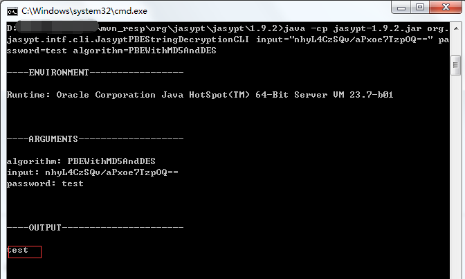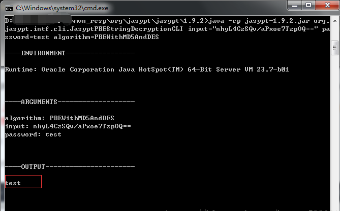 java -cp jasypt-1.9.2.jar org.jasypt.intf.cli.JasyptPBEStringDecryptionCLI input="nhyL4CzSQv/aPxoe7TzpOQ==" password=test algorithm=PBEWithMD5AndDES