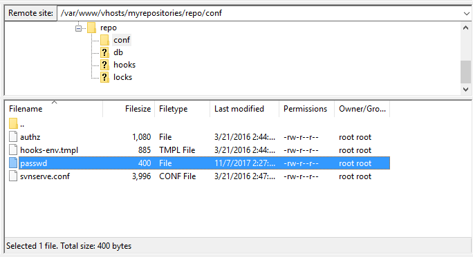 位于confSVN 存儲(chǔ)庫(kù)文件夾內(nèi)的 passwd 文件是一個(gè)文件,該文件以純文本格式存儲(chǔ)有權(quán)訪問存儲(chǔ)庫(kù)的每個(gè)用戶及其密碼。您可以使用 SFTP 客戶端或什至使用 VIM 或 NANO 從命令行編輯文件。在本例中,我們使用 FileZilla 下載并使用自定義文本編輯器編輯文件: