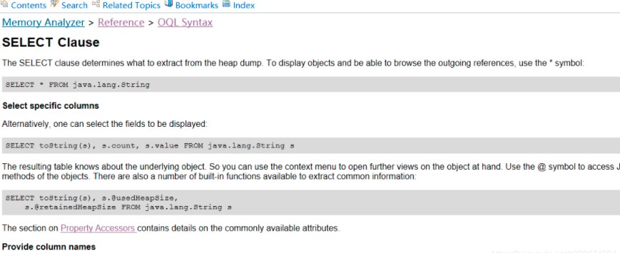 Object Query Language (OQL) ,mat內(nèi)置的對(duì)象查詢(xún)語(yǔ)言,便于統(tǒng)計(jì)分析各種內(nèi)存對(duì)象【注意,這里要結(jié)合對(duì)象占比、線程情況、異常類(lèi)等綜合判斷,查詢(xún)的結(jié)果也可以結(jié)合vim、excel等便于統(tǒng)計(jì)分析】
