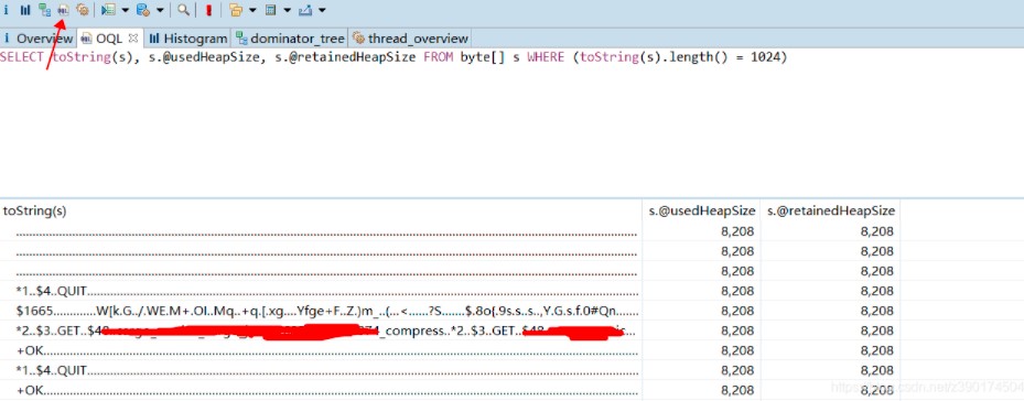 SELECT toString(s), s.@usedHeapSize,s.@retainedHeapSize FROM byte[] s WHERE (toString(s).length() = 1024)