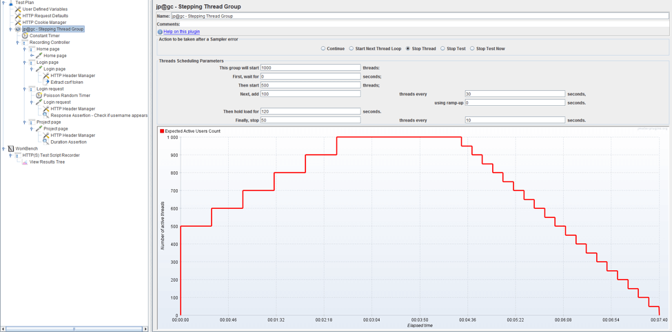 這個測試從我們知道服務(wù)器可以處理的 500 個線程開始。然后,我們將 JMeter 配置為每 30 秒增加 100 個線程。這樣,如果在達到我們的目標(biāo)之前出現(xiàn)問題,我們可以找出問題所在。我們將 1,000 個線程配置為運行 2 分鐘(120 秒)。要查看系統(tǒng)恢復(fù)情況,有一個減速期 - 每 10 秒將停止 50 個線程。