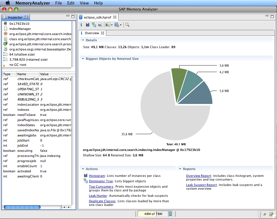 Eclipse Memory Analyzer 是一個全棧 Java 堆分析器,專門用于幫助開發(fā)人員分配內(nèi)存消耗和設(shè)置策略。開發(fā)人員可以使用內(nèi)存分析器工具來分析堆轉(zhuǎn)儲,即使有數(shù)百萬個對象正在通過。他們還可以計算對象的保留大小,以幫助確保垃圾收集器從堆中收集正確的對象。IT 團隊還可以生成臨時報告以提取泄漏嫌疑人。