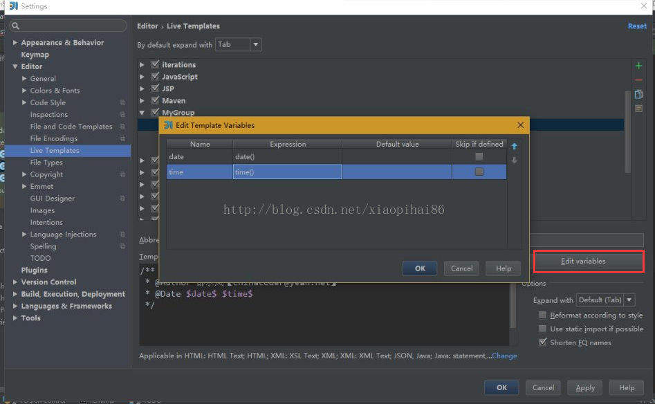 例如Template text中填寫System.out.println($ZHANG$); 然后點(diǎn)擊 Edit variables,彈出的對話框中配置變量替代的方法。
