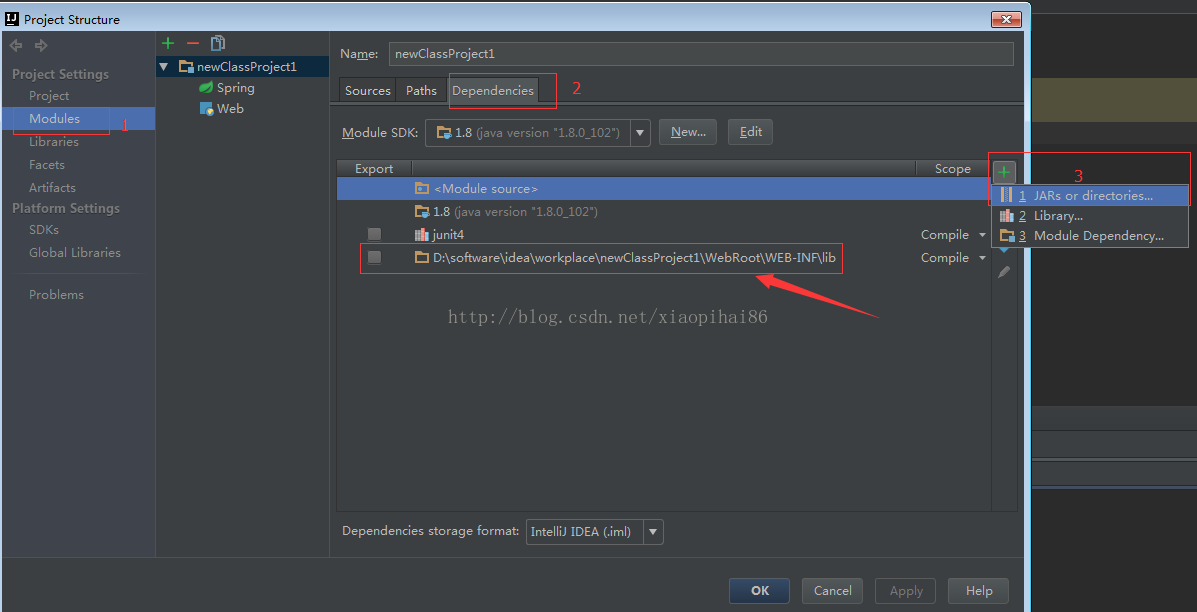然后按照下圖,點(diǎn)擊1,2,3,就出現(xiàn)下圖的3三個(gè)選項(xiàng),選擇jars and directories 選項(xiàng),然后在彈出的目錄框中選擇自己項(xiàng)目中的lib目錄.點(diǎn)擊確定,即可出現(xiàn)下圖中箭頭對應(yīng)的選項(xiàng),這樣即可讓lib目錄正常發(fā)揮作用.