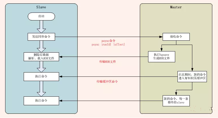 slave第一次啟動(dòng)時(shí),連接Master,發(fā)送PSYNC命令,格式為psync {runId} {offset}{runId} 為master的運(yùn)行id;{offset}為slave自己的復(fù)制偏移量。