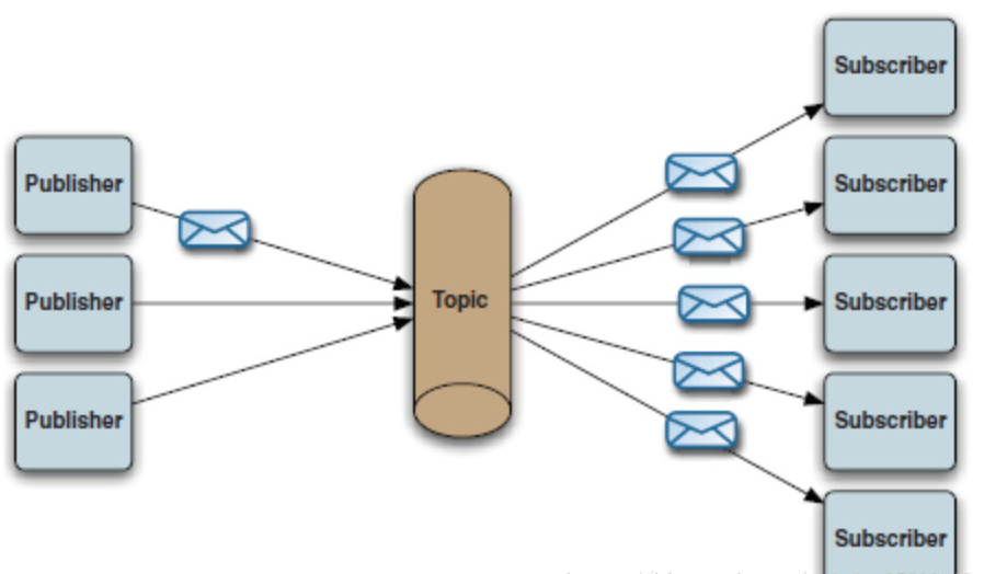 Pub/Sub(發(fā)布/訂閱,Publish/Subscribe)消息域使用 topic 作為 Destination,發(fā)布者向 topic 發(fā)送消息,訂閱者注冊接收來自 topic 的消息。發(fā)送到 topic 的任何消息都將自動(dòng)傳遞給所有訂閱者。接收方式(同步和異步)與 P2P 域相同。