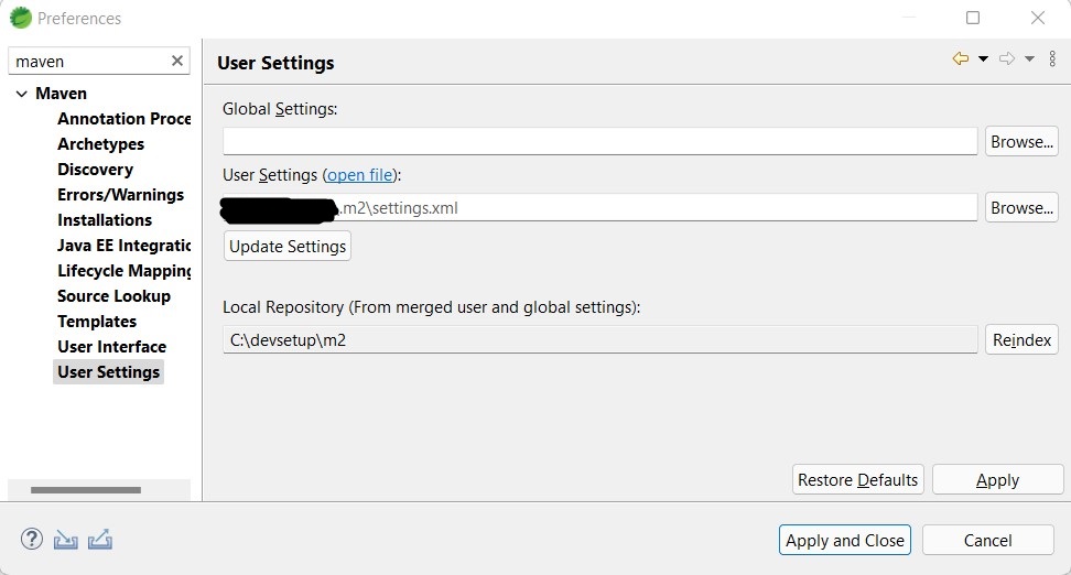 例如在 Eclipse 和 STS ( Spring Tools Suite ) 中,我們可以在以下位置更改本地存儲庫路徑:Windows -> Pfreferences -> Maven -> User Settings