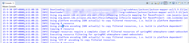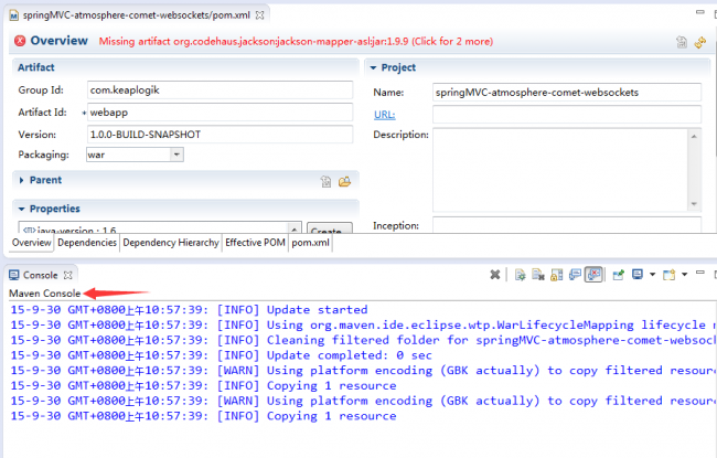 5.隨便編輯pom.xml某處然后保存就可以看到maven console的輸出: