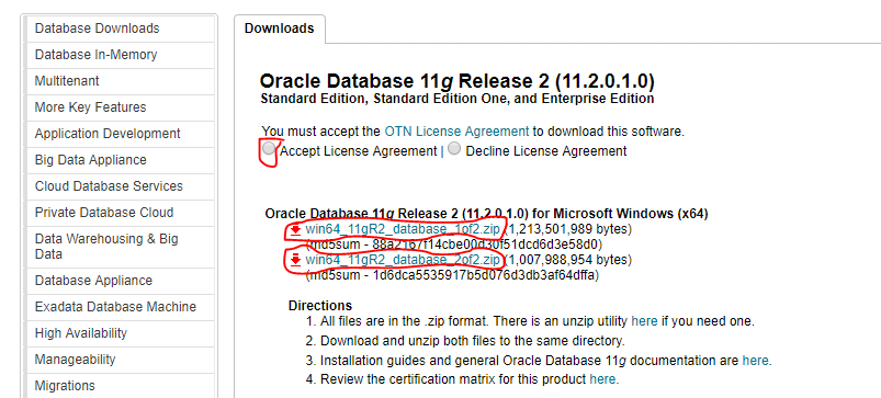 5. 點(diǎn)擊同意下載協(xié)議,下載win64_11gR2_database_1of2.zip和win64_11gR2_database_2of2.zip,即一共需要下載兩個(gè)文件,如下圖所示: