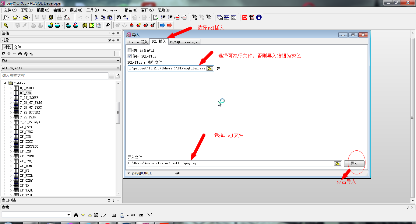 1.導(dǎo)入.sql文件需要sqlplus.exe,導(dǎo)入.bpm文件需要imp.exe,導(dǎo)出.sql直接導(dǎo)出,導(dǎo)出.bmp文件需要exp.exe。