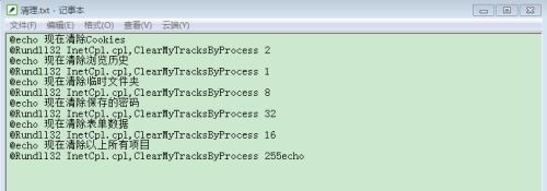 @Rundll32 InetCpl.cpl,ClearMyTracksByProcess 255echo