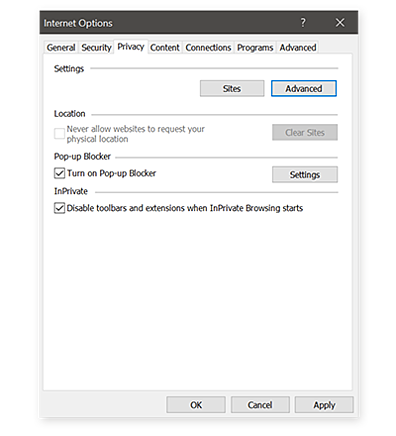 3.選擇隱私選項(xiàng)卡,然后單擊高級(jí)按鈕。