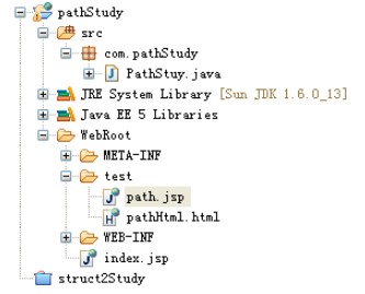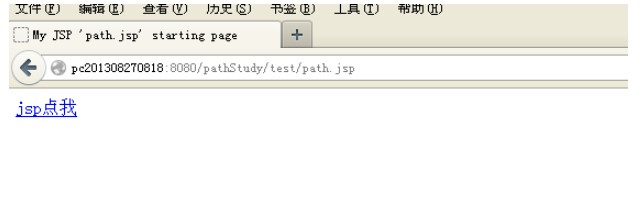 這是文件的目錄結構,我們在path.jsp寫上<a href="pathHtml.html">jsp點我</a>這個標簽我們在pathHtml.html中寫上<a href="path.jsp">html點我</a>這個標簽。運行WEB項目。