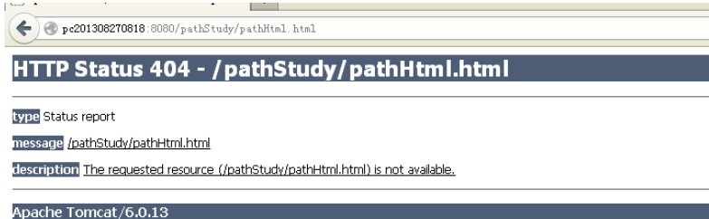 跳到了項目目錄下的pathHtml.html,當然這個頁面是不存在的。為什么同樣的相對路徑指定格式,在JSP和HTML中的結果相差這么大,我們知道相對路徑最終還是要轉換為絕對路徑使用的,轉換成絕對路徑就必須知道相對路徑的基準。所以我們看到上面的結果首先想到的是在默認的HTML頁面和JSP頁面中相對路徑的基準是不一樣的。 在HTML中base標簽用來知道相對路徑的基準,在jsp中自動給我們加了一個base標簽并且指定基準是項目路徑,所以我們無論在哪級目錄中寫的相對路徑都是基于項目路徑的。而默認的HTML頁面沒有base標簽,此時相對路徑就是相對當前頁面的路徑。故得到上面的測試結果。