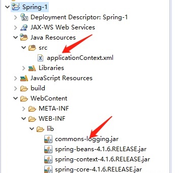 第二步,導入 spring 相關的jar包,導入ApplicationContext 對應的配置文件 ***.xml 到src 下